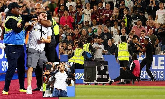 直播吧8月23日讯 《每日邮报》报道,西汉姆球迷因球队惨败于切尔西而情绪失控,在与现场管理人员的冲突中试图冲入球场。